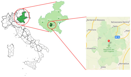 The investigated area was the Euganean Hills Regional Park, which is located in northeastern Italy and includes 15 municipalities and is characterized by a fragmented environment with woodlands, cultivated fields and peri-urban areas that are strictly interconnected. The Euganean Hills have a maximum altitude of 600 m above sea level. (Figure 1).
