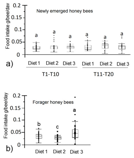 Feed intake of newly emerged from T1 to T10 and from T11 to T20 (a) and forager honey bees (b) fed with control diet and experimental diets (diet 1, diet 2, diet 3 with 0.3%, 1.7% and 7.7% of protein content, respectively). Different letters indicate statistical significance (p < 0.01) by Kruskal–Wallis test.