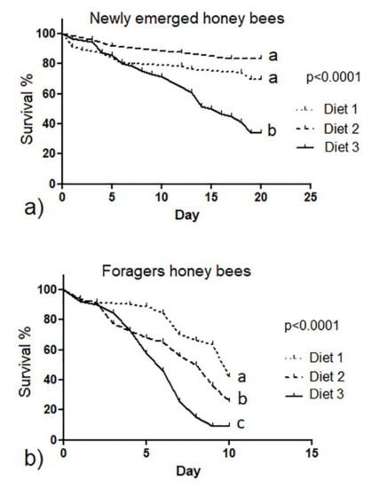 Survival rate of newly emerged (a) and forager honey bees (b) fed with control and experimental diets (diet 1, diet 2 and diet 3 with 0.3%, 1.7% and 7.7% of protein content, respectively). Different letters indicate statistical significance (p < 0.0001) by Kaplan–Meier test.