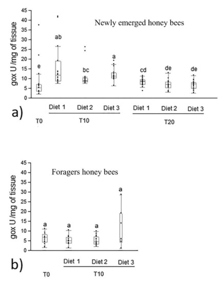 Glucose oxidase activity in newly emerged (a) and forager (b) honey bees fed with control and experimental diets (diet 1, diet 2, diet 3 with 0.3%, 1.7% and 7.7% of protein content, respectively). Different letters on each bar indicate statistical significance (p < 0.0001) by Kruskal–Wallis test. Data were expressed as U/mg of tissue (median, min and max values). T0, T10, T20 were the day of honey bee sampling, n = 15 per bar.