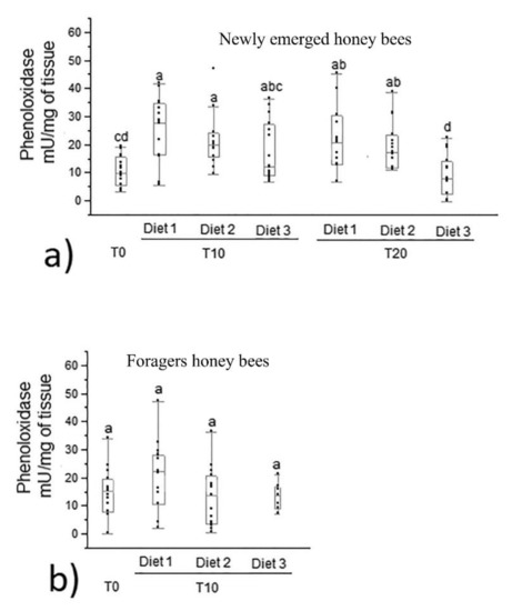 Phenoloxidase activity in newly emerged (a) and forager (b) honey bees fed control and experimental diets (diet 1, diet 2, diet 3 with 0.3%, 1.7% and 7.7% of protein content, respectively). Different letters indicate statistical significance (p < 0.0001) by Kruskal–Wallis test. Data were expressed as mU/mg of tissue (median, min and max values). T0, T10, T20 were the days of honey bees sampling, n = 15 per bar.