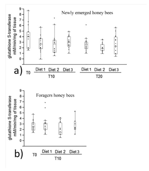 In both newly emerged and forager honey bees, no diet group showed statistical differences in glutathione S-transferase activity at the 10th day of feeding compared to time 0 (Figure 5a,b). In addition, no statistical differences were recorded among each diet group in newly emerged bees in glutathione S-transferase activity at the 10th and 20th day of feeding (p = 0.087, Figure 5a).
