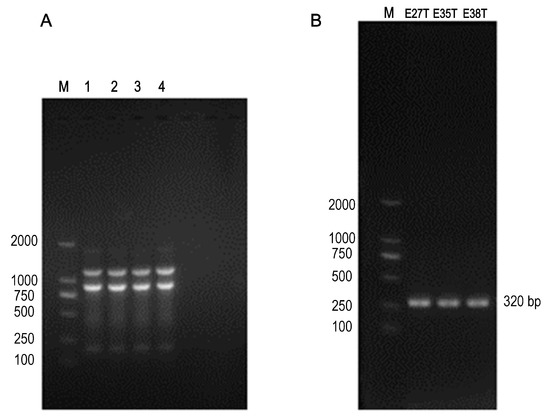 The ERIC-PCR and PCR results. (A) Lanes 1–3: transconjugants EC027/T, EC035/T and EC038/T, lanes 4: C600, M: 2000 DNA marker; The ERIC-PCR result of 3 transconjugants and C600, indicating that these transconjugants and C600 were homologous strains. (B) E27T: EC027/T; E35T: EC035/T; E38T: EC038/T; Sul3 gene was detected in the above three transconjugants.