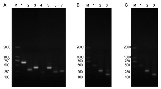 Three transconjugants strains contained drug resistance genes. (A) EC027/T, Note: M: 2000 DNA Marker; Lanes 1–7: blaOXA-1, sul3, tetM, floR, aac(6’)-Ib, sul2, sul1. (B) EC035/T, note: M: 2000 DNA Marker; Lanes 1–3: blaTEM, sul3, tetA. (C) EC038/T, note: M: 2000 DNA Marker; Lanes 1–3: blaTEM, sul3, tetA.