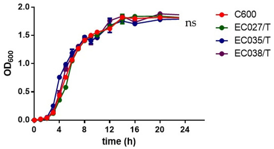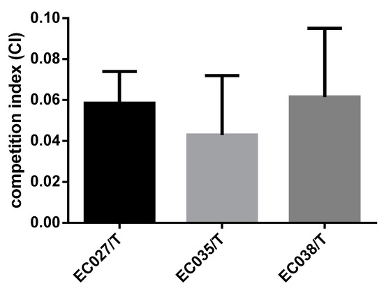 The growth curves of the three transconjugants and the recipient bacteria showed that the transconjugants and the recipient bacteria had minor changes only during the logarithmic growth period, and the changes were not obvious after entering the stable period at 8 h (p > 0.05) (Figure 4). It indicates that the transconjugants have little influence on the growth of the recipient bacteria. In the competitive test, we observed that the competitive index of the three transconjugants was significantly reduced compared with that of the recipient bacteria C600, among which the most obvious one was EC035/T (0.043), followed by EC027/T (0.058) and EC038/T (0.061) (Figure 5). The competition index indicated that the ratios between the CFU of the streptomycin-resistant strain and the streptomycin-sensitive strain were all less than 0.08, revealing that the competitive ability of the transconjugants was greatly weakened in vitro.