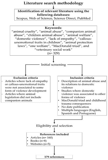 We searched for relevant articles using PubMed, Scopus, Science Direct, and Web of Science. Identification of relevant articles was performed using the following keywords: “animal cruelty”, “animal abuse”, “companion animal abuse”, “children animal abuse”, “animal welfare”, “domestic violence”, “lack of empathy”, “callous-unemotional traits in children”, “animal protection laws”, “one welfare”, “MacDonald triad”, and “veterinary social work”. Included references were articles related to the description of animal abuse and how it is related to domestic violence, the risk factors for the development of animal cruelty in children, and its association to callous-unemotional traits or warning signs that can be used to opportunely detect and prevent domestic violence or other crimes. Likewise, articles about the legislation to protect companion animals, and one health approach programs were also included. There was no settled date of publication to select the articles. The search was conducted in multiple languages (English, Spanish, and Portuguese). The search methodology and the selection of the 179 references used for this review are described in Figure 1.
