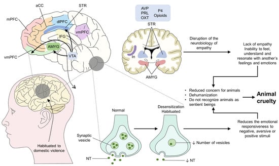 Although the neurobiology of empathy and the effect of violence is not well understood to date, Figure 2 tries to represent the structural and neurobehavioral changes that could explain the development of animal cruelty and its association with domestic violence and lack of empathy. According to the literature, when a person, particularly a child, constantly witnesses domestic violence, apart from the behavioral problems that it entails, children can present difficulty developing empathy or a lack of empathy towards others [50]. When referring to a lack of empathy, the neurological pathway that involves the brainstem, cerebral cortex, and the limbic system with its representative structures—mPFC, aCC, vmPFC, AMYG, IFG, dlPFC, vmPFC, VTA, STR, and In—participates in developing a person’s emotional state and her/his understanding of those of others, a trait that is modulated by individual differences and person-environment aspects [51,52]. When an individual shows traits such as a lack of empathy, this not only represents a social issue but also involves a potential disruption of the neurobiological pathways of empathy development [53]. Additionally, it is said that children and adolescents who are exposed to violence can become emotionally desensitized or habituated to violence [54]. During a process of habituation, some structural changes may cause alterations in the neurotransmitter levels by a reduction in the number of vesicles in the presynaptic neurons and a low concentration in the postsynaptic cleft [55]. The main neurotransmitters implicated in empathy deficits in children are oxytocin and serotonin [52], and dysregulation of endogenous opioids and oxytocin has also been suggested as a potential cause for a dysregulated empathic network [56]. This dysregulation could decrease the transmission of, and responsiveness to, stimuli, whether negative, aversive, or positive [55,57]. As a result of a compromised empathy development, children may be unable to understand the emotions of others or deny that animals are sentient beings [58,59], and these could be possible factors that predispose them to commit acts of animal cruelty.