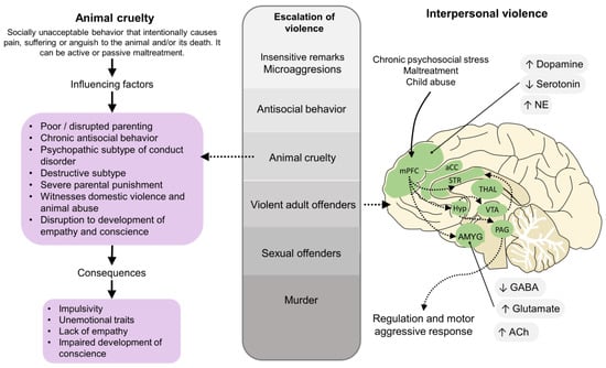 Children engaged in animal abuse are more likely to show violent criminal behavior in adulthood, mainly when acts of animal cruelty are recurrent, engage bestiality, involve drowning, choking, burning, and the motive behind animal cruelty is fun [68,82,83,84]. Empirically, animal abuse has also been related to a tendency towards the emergence of serial killers [85]. Figure 3 schematizes the correlation that the literature has been found between a suggested escalation of violence where animal abuse and its influencing factors may cause progressive violence and aggression towards conspecifics [86]. In fact, animal cruelty has been shown to be a component of the behavioral history of psychopaths and serial killers who began their criminal lives with acts of animal abuse as children or adolescents, since callous-unemotional traits and lack of emotional reactivity are considered the precursors of psychopathy development [87]. In this sense, psychopathy is a neurological disorder characterized by a lack of remorse and empathy, impulsiveness, diminished emotional response to their surroundings, and a higher predisposition to develop criminal behaviors [88]. Adults and children with psychopathy and callous-unemotional traits lack emotional empathy but preserve the cognitive one [89]. However, it is considered that the latter represents the affective domain of the multidimensional structure of psychopathy [90]. Several factors have been shown to influence the development of animal cruelty: e.g., poor parenting, a psychopathic subtype of conduct disorder [91,92], continuously witnessing domestic violence, disruption of the development of empathy, among others [5,91]. The consequences of a lack of empathy and impaired development of conscience are associated with an escalation in violence from animal cruelty to serious offenses, such as sex crimes or murder [92,93,94]. Additionally, when an individual is exposed to chronic psychosocial stress, has a trauma history—such as abuse—or emotional dysregulation, neurotransmitters (serotonin, norepinephrine, GABA, glutamate, or acetylcholine), and cortical and subcortical regions (mPFC, aCC, STR, AMYG; THAL, Hyp, etc.) participate in the brain circuitry that regulates aggressive behavior [95]. Therefore, the promotion of motor aggressive responses towards animals or conspecifics is known to be the result of multisensory cues from the environment [96].