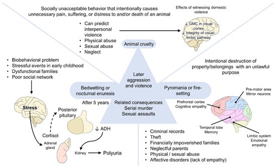 In Figure 4, the components of the McDonald triad and how they can be related are shown. As marked in previous sentences, animal cruelty is associated with an escalation of violence and could be used as an early predictor of interpersonal violence and further abusive acts [124,140]. Firstly, apart from the sociopsychological alterations than can be observed in these children, Teicher et al. [141] have found that childhood maltreatment—including verbal abuse, witnessing domestic violence, and childhood sexual abuse—can have potential effects on brain development, particularly in the structure and functionality of the grey matter (reducing its volume), the inferior longitudinal fasciculus (reducing its integrity), and the somatosensory cortex (reducing the thickness of the cortex). Likewise, young adults witnessing domestic violence were found to show an altered visual-limbic pathway and, therefore, alteration in the integration of emotional experiences [142]. The exposition to stressful or traumatic events during early childhood, such as abuse or domestic violence, is known to have a stronger association with bedwetting, where evidence also mentions the role of cortisol—secreted after stressful events—and its involvement in nocturnal polyuria [143,144]. Finally, pyromania, or fire-setting, is a characteristic that has been reported in individual victims of neglectful parenting, as well as those with affective disorders [145], where a lack of empathy and the altered limbic system circuits can influence, although the contributions of cognitive and affective empathy are still not well understood [146].
