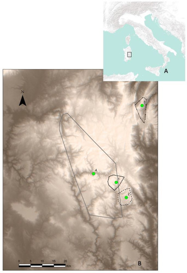 (A) Italy; (B) Sardinian study area: green dots are the reintroduction sites (1, Montarbu; 2, Taccu; 3, Sa Portisca; 4, Rio Nuxi); lines are the outermost locations of Corsican red deer tracked in this study.