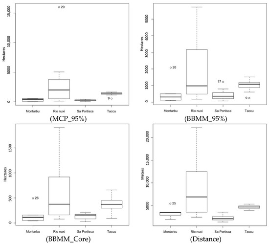 The medians (standard errors) of the variables were: MCP 95% = 671.31 ha (SE = 500.66); BBMM 95% = 834.81 ha (204.50); BBMM Core = 221.79 ha (64.94); and Dist = 4247.46 m (733.65).
