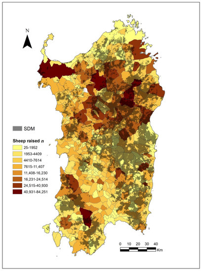 However, this scenario may conflict with the need to limit the spreading of BTV among domestic sheep. As our results showed, Corsican red deer may play an important role as reservoirs of BTV and, as highlighted for other wild ungulates [28,61,62], in the dissemination and persistence of BTV in a habitat. This risk is particularly high in Sardinia, where BTV is widespread. In fact, domestic sheep amount to 3,036,666 heads (57.13% of the Italian grand total) [63], and the SDM we developed showed an overlap of deer-suitable area with the distribution of sheep (Figure 4). Bidirectional virus transmission (carried by Culicoides spp.) is probable, and more information on the interactions between wild and domestic ungulates needs to be acquired and included as predictors of BTV spreading in Sardinia [64].