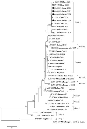 Up to now, over 500 genotypes of E. bieneusi have been identified based on sequences of the internal transcribed spacer (ITS) region of the ribosomal DNA [6], and all genotypes can be allocated into 11 distinct phylogenetic groups (Groups 1 to 11). Group 1 is the largest group that comprises the majority of genotypes isolated from various hosts, including humans, and Group 2 was previously considered to consist of genotypes found in ruminants, but some of these genotypes are also found in humans [7], such as genotype I, J, BEB4, and BEB6 [8]. Groups 3–11 are host adaptation groups and might be present in specific hosts and wastewater [9]. At present, all the genotypes of E. bieneusi detected in sheep belonged to Groups 1, 2, and 7 [7].