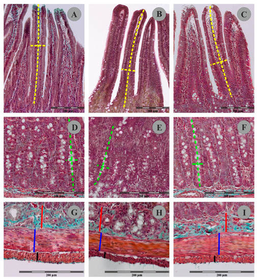 | Villus width (µm) | 75.90 ± 6.28 a | 76.59 ± 3.56 a | 100.85 ± 15.76 b | <0.001 |