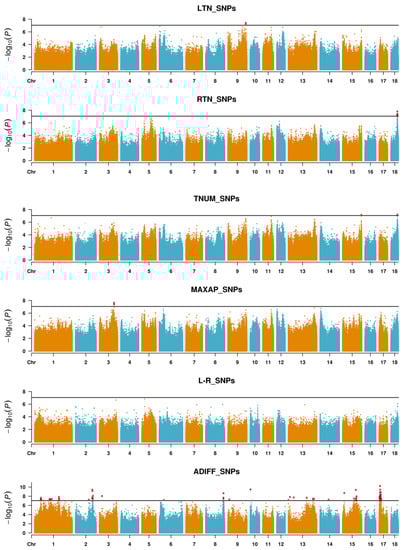 Manhattan plots of GLM GWAS for teat number-related traits in Qingping pigs, including LTN, RTN, TNUM, MAXAP, L-R and ADIFF based on SNPs. LTN: the number of teats on the left side; RTN: the number of teats on the right side; TNUM: the total number of teats (TNUM = LTN + RTN); MAXAP: the maximum number of teats in LTN and RTN (MAXAP); L-R: the difference between the two sides (L-R = LTN − RTN); ADIFF: the absolute difference between left and right teat number (ADIFF = |LTN − RTN|).