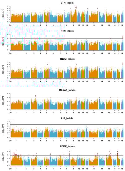 Manhattan plots of GLM GWAS for teat number-related traits in Qingping pigs, including LTN, RTN, TNUM, MAXAP, L-R and ADIFF based on Indels. LTN: the number of teats on the left side; RTN: the number of teats on the right side; TNUM: the total number of teats (TNUM = LTN + RTN); MAXAP: the maximum number of teats in LTN and RTN (MAXAP); L-R: the difference between the two sides (L-R = LTN − RTN); ADIFF: the absolute difference between left and right teat number (ADIFF = |LTN − RTN|).