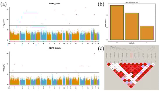 FarmCPU GWAS for ADIFF. (a) Manhattan plots of the GWAS based on SNPs and Indels. (b) Difference analysis of the strongest significant SNP (rs322863105) on SSC17 in GLM, which was retested in FarmCPU. (c) Haplotype block analysis of selected suggestive significant SNPs associated with ADIFF on SSC17 in GLM, including rs322863105. ADIFF: the absolute difference between left and right teat number (ADIFF = |LTN − RTN|).