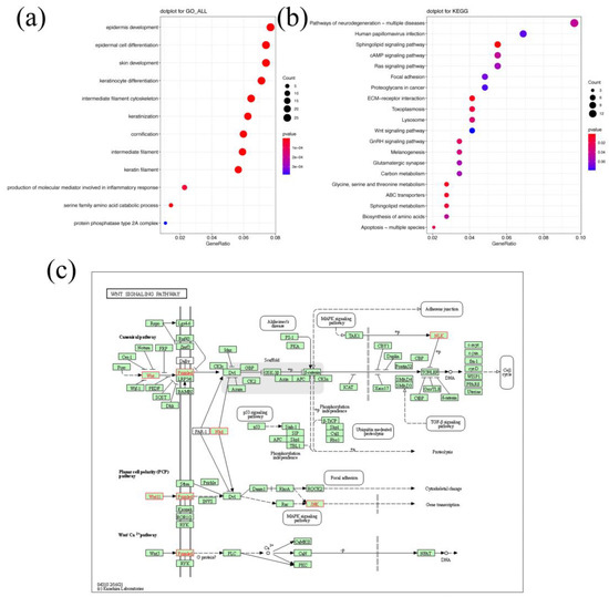 Annotated genes within 1-Mb regions of significant SNPs and Indels were defined as candidate genes. A total of 397 annotated genes were found in these regions (Table S2). In Figure 5a, GO enrichment analysis showed the enrichment of these candidate genes in epidermis development (p = 2.31 × 10−7), epidermal cell differentiation (p = 4.61 × 10−9), and skin development (p = 1.12 × 10−7). In Figure 5b KEGG pathway analysis revealed the enrichment of candidate genes in the pathways, such as the Sphingolipid signaling pathway (p = 1.27 × 10−3), ECM-receptor interaction (p = 4.79 × 10−3), and Glycine, serine and threonine metabolism (p = 5.43 × 10−3). Furthermore, we also paid attention to the Wnt signaling pathway (Figure 5c), due to its important role in initiating mammary morphogenesis and all subsequent stages of mammary formation as previously reported [33].