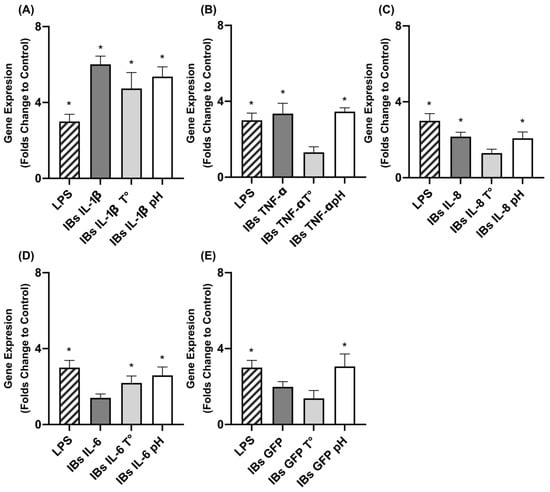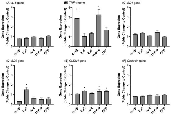 Analysis of gene expressions of (A) IL-6, (B) TNF-α, (C) BD1, (D) BD2, (E) CLDN4, and (F) Occludin, in folds compared to negative control in the IPEC-J2 cell line. Grey bars indicate treatment with 6.25 μg total protein/mL. GFP IBs and PBS were used as format control and negative inflammatory control, respectively. Error bars indicate the standard error of the mean (SEM). Asterisks show statistically significant differences in expression folds between PBS and treatments. (A) p = 0.030; (B) p = 0.0004; (C) p = 0.0108; (D) p = 0.0001; (E) p = 0.0006; (F) p = 0.5059.