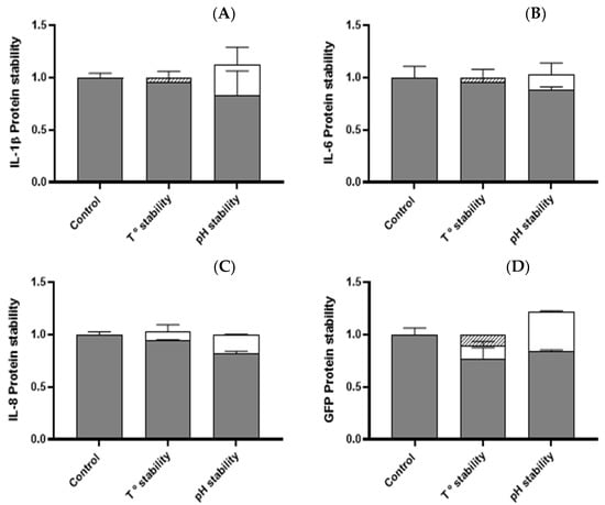 Protein distribution between soluble (white), insoluble (grey), or degraded fractions (striped) after temperature and pH challenge in (A) IL1β-, (B) IL6-, (C) IL8-, and (D) GFP-based IBs.
