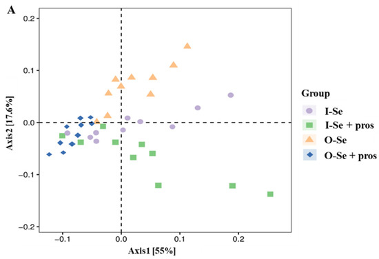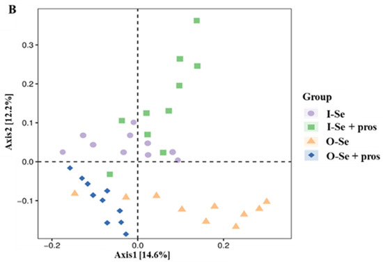 The weighted UniFrac distance metric (A) and unweighted UniFrac distance metric (B) of the cecal content of broilers fed with I-Se, I-Se + pros, O-Se, O-Se + pros (n = 10).