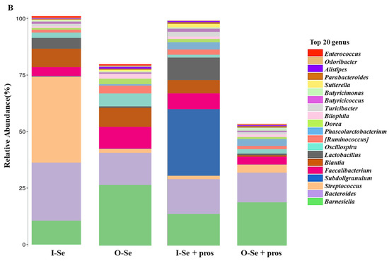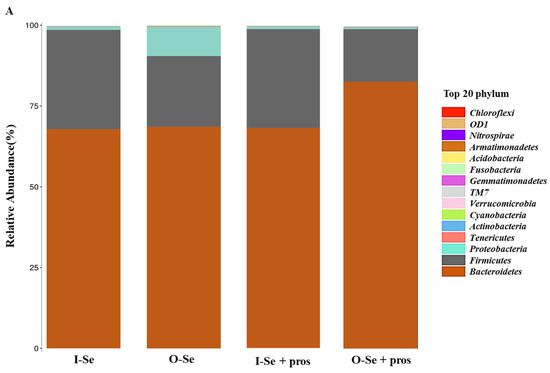 Bacterial composition at the phylum level (A) and genus level (B) in the cecal content of broilers fed with I-Se, I-Se + pros, O-Se, O-Se + pros (n = 10).