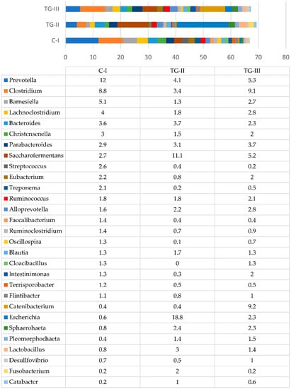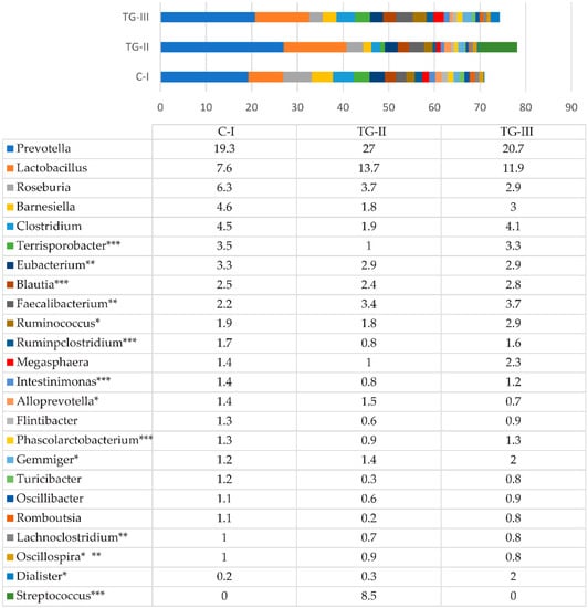 Bacterial composition of piglets’ faeces at the end of the experimental treatment (day 62). The data only represent those genera whose numbers from all the bacterial amounts were at least 1% in any of the animal groups. * Statistically insignificant results between C-I and TG-II. ** Statistically insignificant results between TG-II and TG-III. *** Statistically insignificant results between C-I and TG-III.