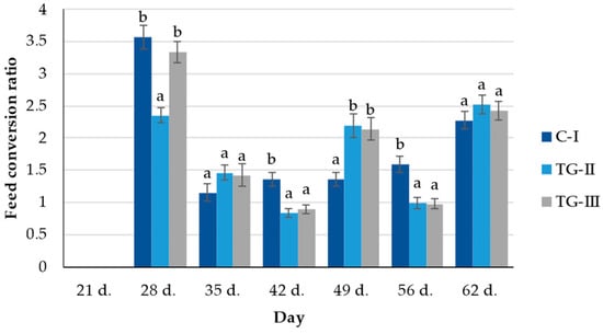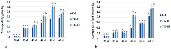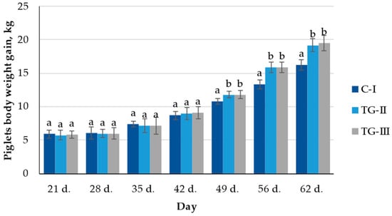 In the comparison of piglets’ body weight (BW) gain, no significant differences between the groups after 21, 28, and 35 days were established (Figure 3). However, after 42 days, a significantly higher BW occurred in the TG-III group piglets (2.8% higher on average in comparison with the control and TG-II groups). After 49, 56, and 62 days, both treatment groups showed a significantly higher BW in comparison with the control group (9.1, 16.4, and 15.9% on average, respectively).