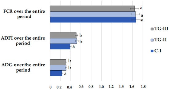 Feed conversion ratio (FCR), average daily feed intake (ADFI), and average daily gain (ADG) over the entire period (a,b different letters indicate differences among treatments, p < 0.05; C-I—control group TG-II—treatment group with extruded–fermented wheat bran addition; TG-III—treatment group with sugar beet pulp).