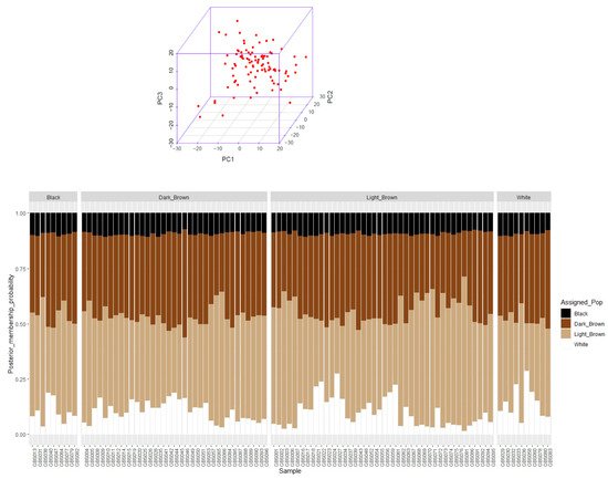 Principal component analysis of 96 dromedary camels of Iran central desert using 14,522 SNPs in five regions in above figure (A). Admixture of 96 dromedary camels among four coat colors: light-brown, dark-brown, black, and white, where the x-axis shows sample number and the y-axis show the probability of each camel belongs to coat color (color = K) in bottom figure (B).