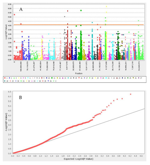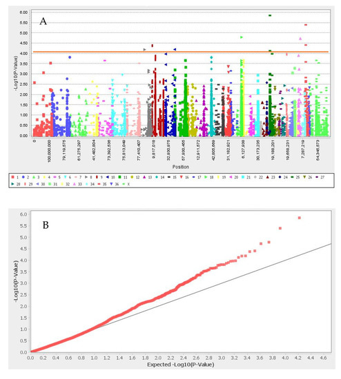 Manhattan plot (A) and q–q plot (B) of coat color for black color. Red line in Manhattan plot is Bonferroni threshold. The chromosomal position of each SNP was displayed in different colors in Manhattan plot. Red and gray line in the q–q plots represent the −log p-value of the entire study and expected value, respectively.