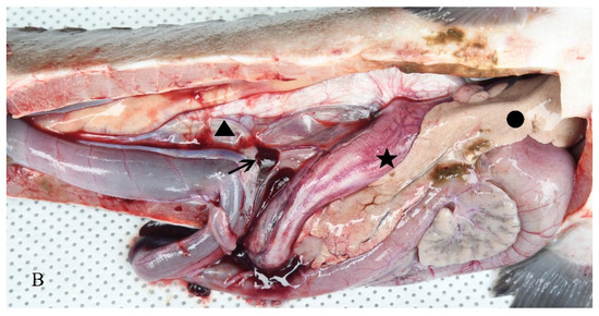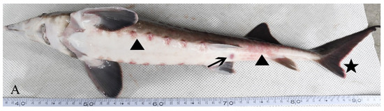Clinical symptoms of an H-701-infected hybrid sturgeon: (A) Body surface (triangle), cloacal orifice (arrow), and fin (asterisk); (B) Ascites (triangle), liver whitening (dot), intestinal wall bleeding (asterisk), and spleen redness (arrow).