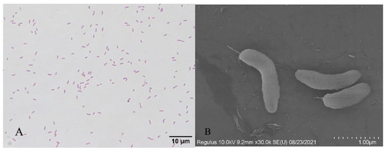 The H-701 strain was grown on a BHI agar medium, and the colony surface was smooth, moist, and grayish white. Optical microscopy showed that the cells were stained red (Gram-negative) after Gram staining and were curved, short, and rod-shaped (Figure 2). Scanning electron microscopy showed that the bacterial cells were arc-shaped and approximately 1.5 µm long (Figure 2).