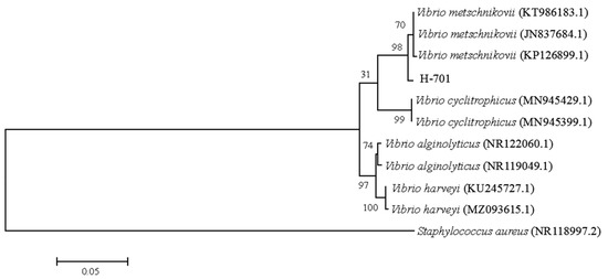 The nucleotide sequence of the H-701 strain was compared with the NCBI database (http://blast.ncbi.nlm.nih.gov), and it showed >99.86% homology with the 16S rRNA gene sequence of Vibrio metschnikovii included in GenBank (GenBank accession no. KT986183.1). Using MEGA 6.0 software, the nucleotide sequences of the isolated strains were analyzed for homology with the nucleotide sequences of similar strains downloaded from NCBI. A phylogenetic tree was constructed using the neighbor-joining method [24]. The H-701 strain was clustered in the same clade as V. metschnikovii (Figure 3).