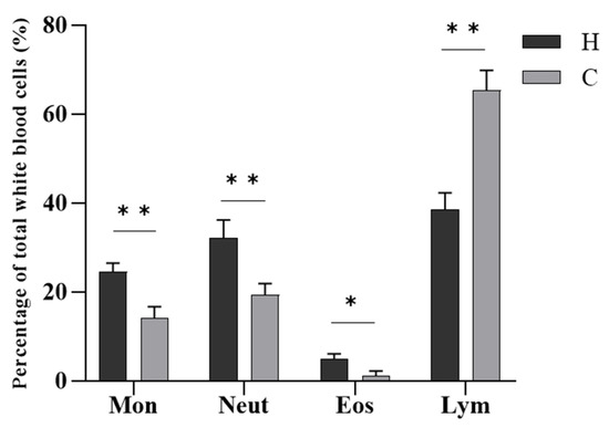 Differential leukocyte counts of hybrid sturgeon. Mon, monocytes; Neut, neutrophils; Eos, eosinophils; Lym, lymphocytes; H, diseased hybrid sturgeon (H-701); C, healthy hybrid sturgeon (Control); * p < 0.05; ** p < 0.01.