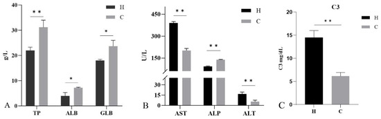 Serum biochemical indices of hybrid sturgeon: (A) Total protein (TP), albumin (ALB), and globulin (GLB); (B) Aspartate aminotransferase (AST), alkaline phosphatase (ALP), and alanine aminotransferase (ALT); (C) Complement C3 (C3). H, diseased hybrid sturgeon (H-701); C, healthy hybrid sturgeon (Control); * p < 0.05; ** p < 0.01.