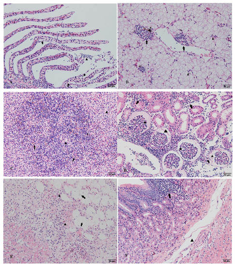 - Jiang, N.; Xu, J.; Ma, J.; Fan, Y.D.; Zhou, Y.; Liu, W.Z.; Zheng, L.B. Histopathology and ultrastructural pathology of cyprinid herpesvirus II(CyHV-2) infection in gibel carp, Carassius auratus gibelio. Wuhan Univ. J. Nat. Sci. 2015, 20, 413–420. [Google Scholar] [CrossRef]