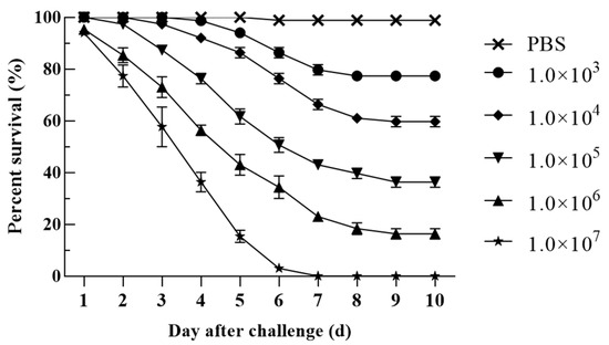 Bacterial concentration was calculated using the plate colony counting method [21]. The healthy hybrid sturgeon were randomly divided into six groups with 30 fish per group. The experimental fish in each group were raised in an independent circulating water system, and the size of the water tank was 1 m × 0.8 m × 0.6 m. The water temperature was 20 ± 1 °C and the pH value was 7.5. The experimental groups were injected intraperitoneally with bacterial solutions of 103, 104, 105, 106, and 107 colony-forming units (CFU)/g fish weight. The control group fish were injected with sterile PBS. After infection, the inoculated fish were observed for 10 consecutive days, and the number of deaths in each group was counted every day. Bacteria were isolated from diseased fish and identified again. The experiment was repeated three times. The 50% lethal dose (LD50) value of the H-701 strain was calculated by the method of Reed and Muench [22].