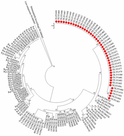 - Liang, J.X. Based on Cytb and D-Loop Region Sequence Analysis of the Pedigree Geography of Batrachuperus Taibaienses; Shaanxi Normal University: Xi’ an, China, 2010. (In Chinese) [Google Scholar]