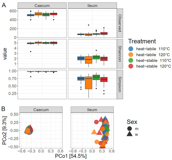 Alpha diversity differed significantly between the gut sections (p < 0.01). The caecum showed approximately five times more observed reads than the ileum. The Shannon and Simpson diversity indices were higher in the caecum, indicating a higher species richness and evenness (Figure 1A). Feeding the heat-stable soybean variety led to a higher number of observed reads in the ileum (p < 0.05). No further differences between heat treatment, variety or sex were observed regarding alpha diversity. Principal component analysis revealed a higher homogeneity between samples in the caecum than in the ileum (Figure 1B). However, beta diversity analysis indicated no differences in heat treatment parameters, variety or sex.