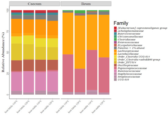In total, 18 taxonomic families with relative abundances of over 1% were observed in the caecum and ileum of the studied animals (Figure 3). The Ruminococcaceae, Lachnospiraceae and Clostridia vadinBB60 groups represented the most dominant families in the caecum, with abundances of 23.2%, 17.3% and 16.8%, respectively. Two families dominated the microbiota of the ileum, Lactobaccillaceae (35.4%) and Peptostreprococcaceae (33.4%).