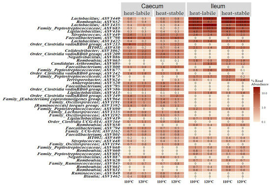 Figure 4 shows the 50 most abundant ASVs in the caecum and ileum with detailed abundances for soybean variety and heat treatment. A small number of ASVs dominated the microbiota of the ileum, mainly members of two orders, Bacilli and Clostridia, which contributed to more than 5% of the relative abundance each. The relative abundance of ASVs in the caecum was more evenly distributed, with none making up more than 6% of reads for any treatment.