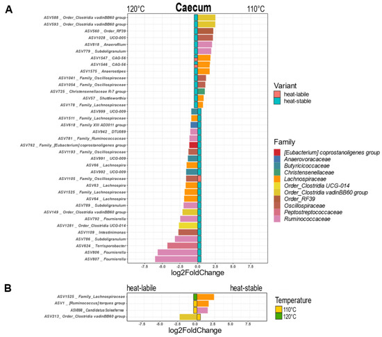 In the caecum, a considerable number of ASVs associated with eleven families were influenced by the intensity of heat treatment of soybeans (Figure 5A). The majority of ASVs were affected only when the heat-stable variety was fed. Soybean processing at 110 °C significantly increased the abundance of members of six families belonging to two phyla (Firmicutes and Tenericutes). Members of nine families (all Firmicutes) were more frequent when 120 °C was applied to soybeans. The abundance of four ASVs was significantly influenced by the soybean variety (Figure 5B). Clostridia vadinBB60 was more abundant with the heat-labile variety, while two members of the family Lachnospiraceae and one member of Ruminococcaceae were more frequent when the heat-stable variety was fed.