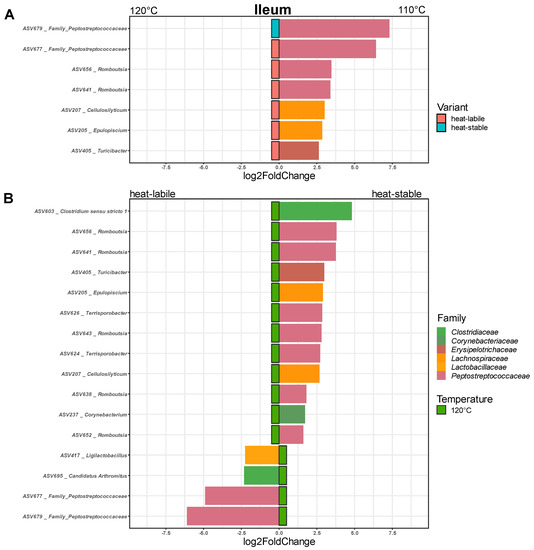 In the ileum, only Firmicutes were affected. The application of 110 °C in soybean treatment led to an increase in the relative abundance of seven ASVs, four members of Peptostreptococcaceae, two Lachnospiraceae and one Erysipelotrichaceae (Figure 6A). The soybean variety affected the abundance of 16 ASVs (Figure 6B). Feeding of the heat-stable variety led to an increased abundance of members of five families. The heat-labile variety caused an increase in two Peptostreptococcaceae, one Clostridiaceae and one Lactobacillaceae.