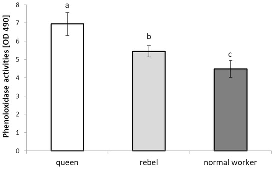 Phenoloxidase activities in the hemolymph of the A. mellifera queens, rebels, and normal (sterile non-rebel) workers. Lowercase letters indicate significant differences between phenotypes (queen/rebel/normal worker) with p < 0.05.