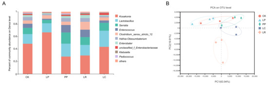 The bacterial community based on genus-level classification is shown in Figure 1A. The dominant genera included Kosakonia (0.4851) and Lactobacillus (0.1548) in the CK group. The main genera in LP group were Kosakonia (0.6670) and Lactobacillus (0.1475). In addition, the dominant genera in PP group were Kosakonia (0.2785) and Lactobacillus (0.2069). Kosakonia (0.2963) and Lactobacillus (0.1689) were the dominant genera in LR. Kosakonia (0.4359) and Lactobacillus (0.2573) were also the dominant genera in the LC group. Principle component analysis (PCA) revealed that components 1 and 2 could explain 63.94% and 19.91% of the total variation, respectively. LR was different from the other treatment groups, and LP and CK were similar but different from the other groups (Figure 1B). It also indicates that LR was located outside the gathering point of all the groups.