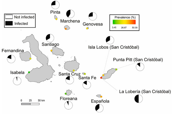 Scheibel, J.; Garcia-Porta, J.; Quezada, G.; Ibáñez, A. Phylogeography and Prevalence of Hemoparasites (Apicomplexa: Eucoccidiorida) in Galápagos Marine Iguanas, Amblyrhynchus cristatus (Reptilia: Iguanidae). Animals 2022, 12, 1142. https://doi.org/10.3390/ani12091142
