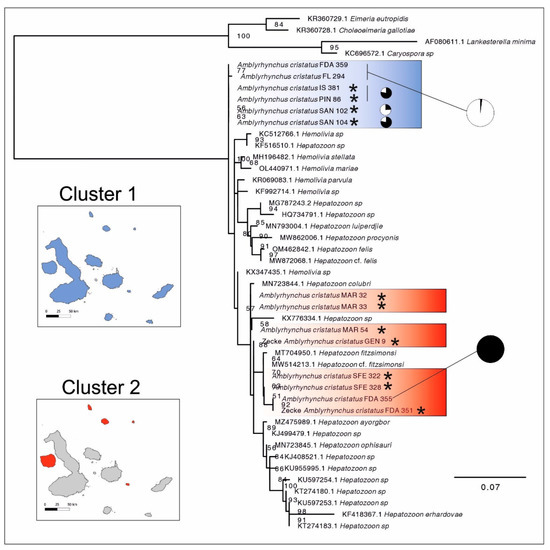 Chicago/Turabian StyleScheibel, Jessica, Joan Garcia-Porta, Galo Quezada, and Alejandro Ibáñez. 2022. "Phylogeography and Prevalence of Hemoparasites (Apicomplexa: Eucoccidiorida) in Galápagos Marine Iguanas, Amblyrhynchus cristatus (Reptilia: Iguanidae)" Animals 12, no. 9: 1142. https://doi.org/10.3390/ani12091142