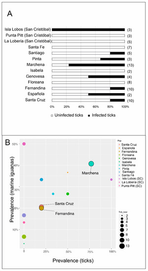 3.3. Tick Hemoparasites and Comparison to the Infection Status of Marine Iguanas