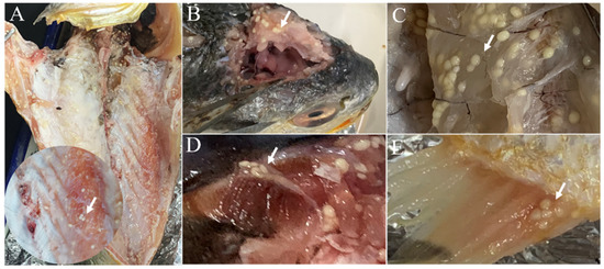 Main tissue and organs of large yellow croaker, Larimichthys crocea, with Kudoa infection. (A) Muscle with myoliquefaction. (B) Kudoa cysts on brain cartilage. (C) Kudoa cysts on dorsal muscle. (D) Kudoa cysts on gill arch. (E) Kudoa cyst on anal fin. White arrows: Kudoa cysts.